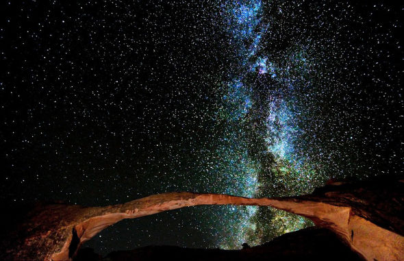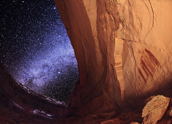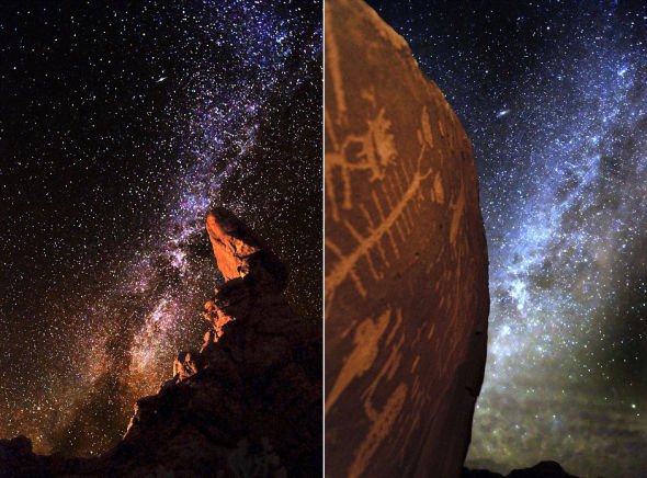 在犹他州拱门国家公园平衡石附近,韦伯斯特利用特殊照明设备和银河系塑造了犹如外星世界的景观(左)。美丽的银河成为岩石上的本土美洲艺术品的背景(右)。