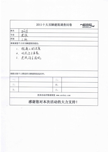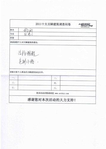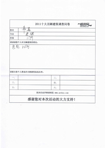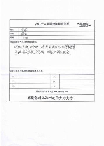 为促进建筑行业健康理性发展,畅言网在举办2010中国十大丑陋建筑评选活动后,2011中国十大丑陋建筑评选活动随即展开。为让更多建筑界人士参与到评选中来,畅言网特走进全国各大设计院,以期聆听来自一线设计师们的声音。以下是我们对中南建筑设计院股份有限公司设计师们的采访,感谢大家的关注和支持。