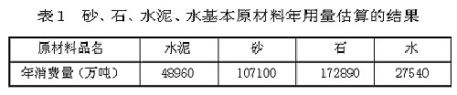 根据2003年混凝土产量,估算用于混凝土中的砂、石、水泥、水基本原材料年用量如表1所示。