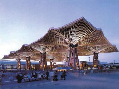 2000年汉诺威世博会“大屋顶”的设计是原生性材料与现代技术生态学的完美结合。德国建筑师赫尔佐格教授( Thomas Herzog)所言:“任何一种具体系统的设计与确定,都是与各个工种的工程师共同完成的,其整个过程持续了很长的时间,并且反复经过了下列几个阶段:模型设计阶段、计算阶段、模拟阶段、风洞试验阶段、荷载试验阶段和设计研究阶段”。在设计概念中,采用“大屋顶”这种形式和采用木材等,都是赫尔佐格教授在建筑的设计构思和概念设计阶段便已经确定好的。而深化设计的每一个设计阶段,都有相关学科专业人员的介入。这个尺度巨大的木结构物结合了现代制造工艺与传统技艺覆以半透明的隔膜(ETFE)来抵御气候的影响,以其沉静的色彩和丰富的形态,成为一个令人印象深刻的现代木结构设计的范例。