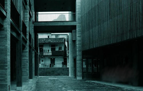 标准营造事务所设计的阳朔小街坊如图10所示,他们把当地建筑传统材料即竹子进行另一种尝试。在这里,当地竹茎被劈裂成窄片,侧向紧密排列成隔栅包裹在建筑的表面。从建筑的正面和侧面观看带来不同的效果,自然处理的竹片满足了采光和通风需求,并完全融入到阳朔石和杉木板的城市肌理中。