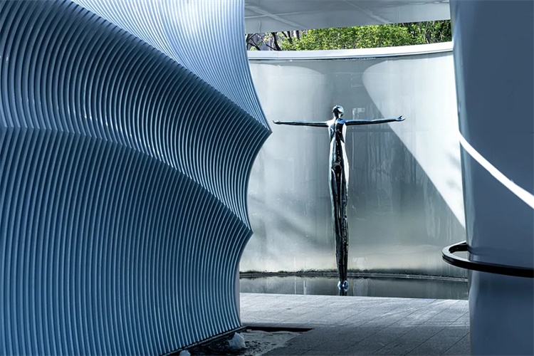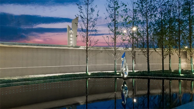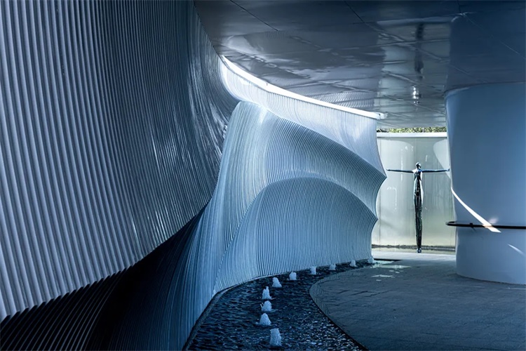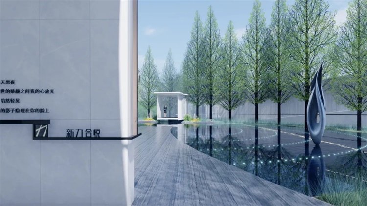弧形廊道连通入口与售楼部,以委婉曲折的形式,营造丰富、艺术、深邃的意境空间,增添行走乐趣。连廊与中庭相连,室内室外空间相互交融。行走之中,步移景异,感受到不同空间尺度变化带来的自由感。弧形种植池呼应弧形廊道,水景被水杉林切割而富有线条感,形成错落丰富的景观层次。
