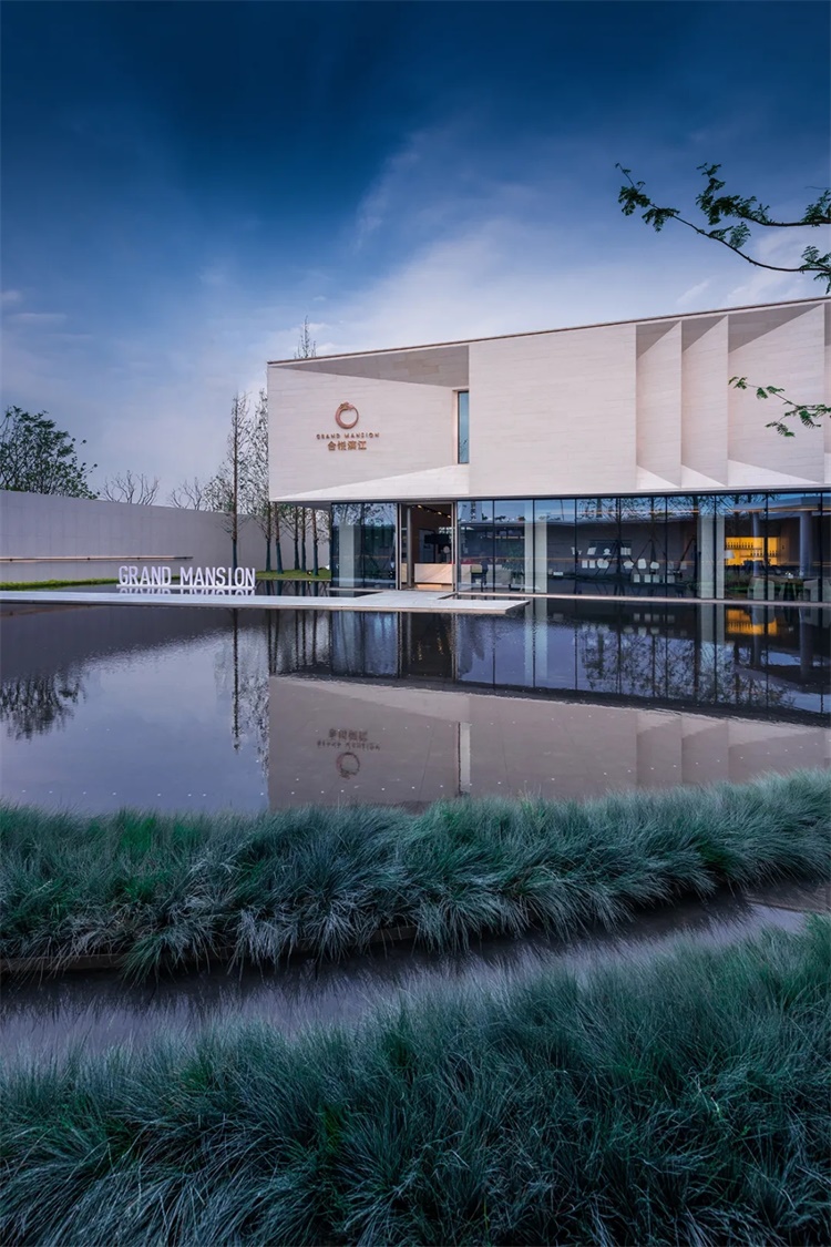 廊架与水庭,通过空间的渗透,虚实的对比,融合成一个整体。光影与景墙、格栅相遇,形成流动的虚实对比。大面积静水面引天地入画,写意“落霞与孤鹜齐飞,秋水共长天一色”的壮阔美感,极大地增强了空间感。外部景观透过玻璃进入售楼部,丰富了观者对美的感知与共鸣。