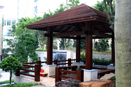 根据地貌地形,在典雅古朴的庭院下,设计的跌水景墙,展翅的白鹅喷泉雕塑,一池清水边上点缀清秀雅致的五针松,将中国传统的文化气息融入其中。