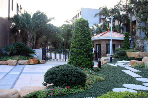 塔形罗汉松与石头景观的搭配,与圆球形的米兰、黄金榕相对比,以及花钵的设置等别出心裁的设计,巧妙的渲染了整个环境。