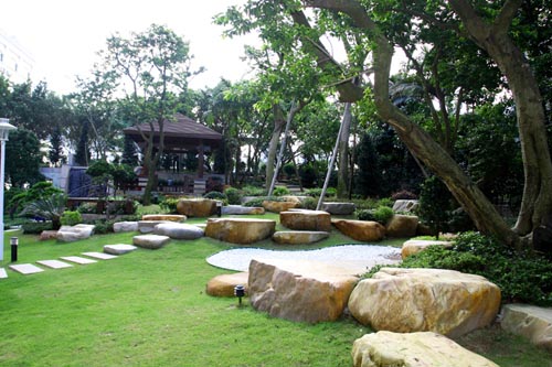白色碎石、卵石随着园路的延伸铺设的园地,将造型精致的汀步完美呈现,入口处丛植的蜜枣下配置较耐荫的苏铁,时花为地被,进行陪衬,形状不一的黄蜡石围成花台,新颖别致。