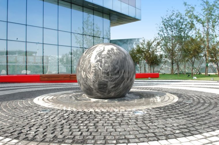 硬质景观同心圆的组成与禅意花园的组成,在视觉上建立了非常强烈的联系。同时也创造了强大的中心感及集散空间。停车广场的中心也强化了禅意的传统:一棵造型油松,规则条状种植的大叶黄杨篱及两个巨大匍匐的巨石构成不对称的特色元素。当走向建筑时,会遇到一个7.6吨重的风水球。花岗岩风水球静静的在薄薄的水面上转动,用一个大手笔来诠释一个通俗的中国造园元素。