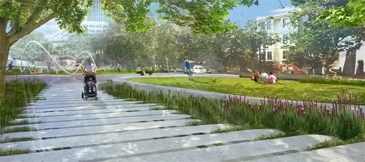 使用一个单独的,漫步小路连接公共广场、非正式舞台、生物滞留池花园、微坡草坪还有一个给周围社区邻居做的游玩构造,本公园将截然不同的功能整合在一起,并且创造了一个空间可以提供给各类人群使用。