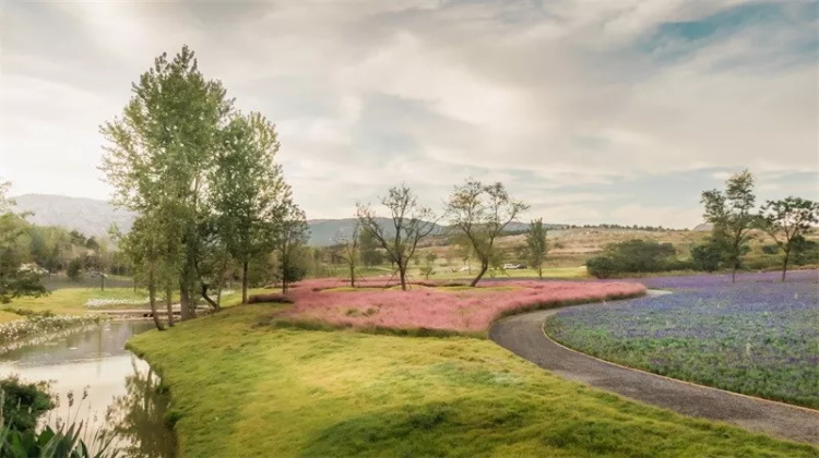 项目分为花海风情区和骑行体验区,在设计上沿袭与其他地块相辅相成的山水田园小镇设计风格,景观骑行展示区设置可供游人体验的自行车道,穿行于林间和自然小溪之间,实现休闲漫步、观马、骑自行车等功能;花海风情区则汲取藏马山的龙马精神,打造标志性骏马与祥龙结合图案的14万平米花海,以大地艺术的手法打造西海岸最新地标。