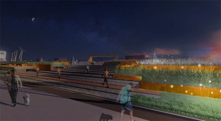 每一个景观塔的灯光不仅代表一种月相,还可以根据月相进行整体灯光的组合,同时可以通过自身颜色的变化记录飞云江的潮起潮落。栏杆上的“听潮”和“舞潮”装置使岸上的人更加直接地感受潮水。