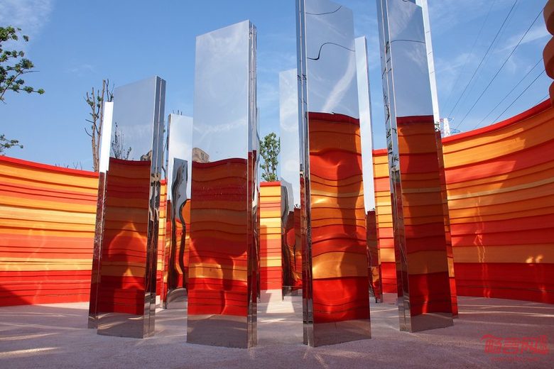 巷道的表面肌理塑造采用GRC材料,一层层的凹凸叠层,隐喻般的表达了垃圾堆积分层的肌理,塑造了百转千回的曲面空间,并有效的降低了施工难度和造价。墙体喷涂渐变橙黄色仿石漆,低成本高环保,并可每年喷涂更新,达到日久弥新的感觉,免除令人困扰的后期维护难题。