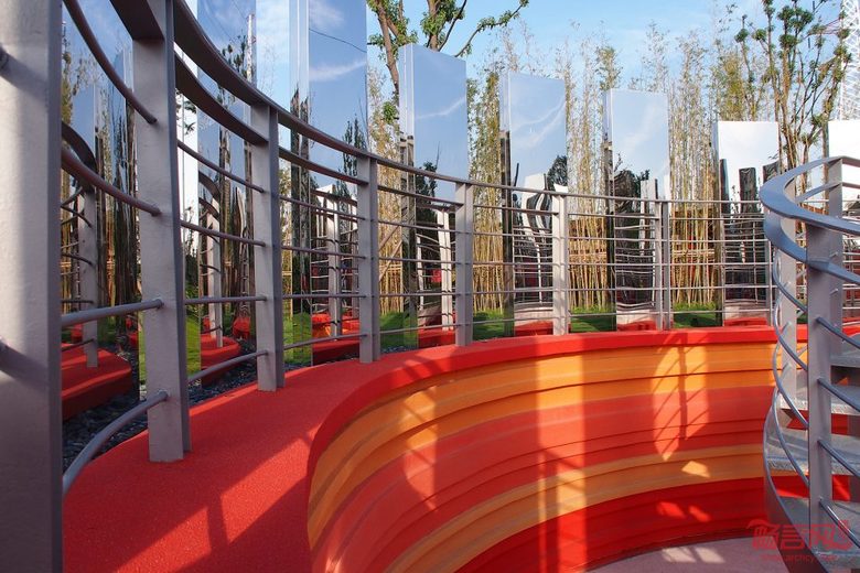 沉淀园东西长50米,南北宽20米左右,面积狭小。作为唯一一个深挖的展园,设计师将其下沉3米,利用一条1.2米宽的彩色“峡谷”在极小的展园内实现了长达150米长的游园动线,曲径通幽的流线恰似“桃花源记”中对未知探索的奇趣。峡谷中创造了两个大的空间节点,开合有致,与狭窄的巷道产生鲜明的对比。地面上的人可以扶着矮墙观看并与峡谷中的游人进行互动,并告知其未知前方的情况。