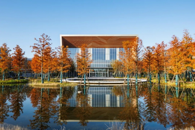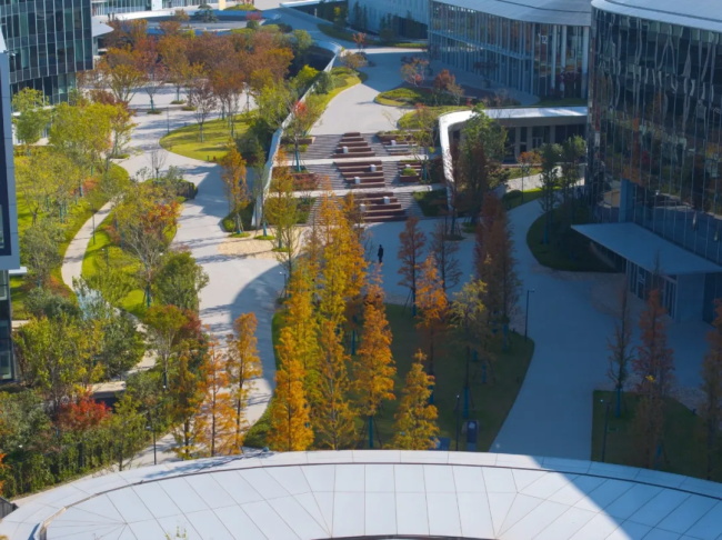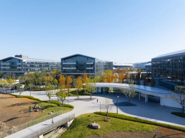 项目总占地22.8公顷,景观面积15.7公顷,树叶形状的空间结构形成建筑和景观互为图底的拓扑关系,为建筑创造最优的景观视线联系,也为内外景观的渗透带来先天优势。景观设计从景观视线通廊控制、栖息地营造、慢行系统连接等多个设计策略将园区内部的景观和外部的生态廊道联系起来,使场地同山水空间有机的生长在一起。