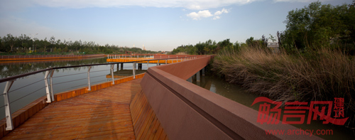 大面积的舶来草坪与异域树林装点下的空间,不是我们对景观概念的诠释。立足生态的自然本底,构筑新美学下的艺术景观空间是这次滨水公园的设计要点。在自然地基础上,对生态植被进行调整和疏导,形成生态自然、精致有序的植被群落新景象。艺术的水上栈桥,以不破坏整体生态的环境为底线,以城市艺术雕塑的形象需求为出发点,塑造连续的形体和精美的细节形成艺术交织的火花,满足独特休闲体验的同时为区域带来建筑艺术的新活力;彩色的自行车道采用软性的基础和透气的表面材料,绿色建筑下的商业休闲服务空间,生态贯通的退台驳岸,在运营新美学的构建中,试图渲染艺术与活力的场所氛围。