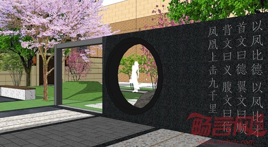 在设计中大量的运用了构筑物造型、刻诗词、雕塑装置品等不同手法来充分突出此主题。