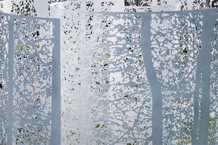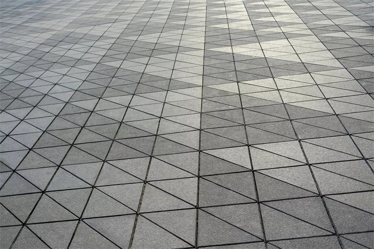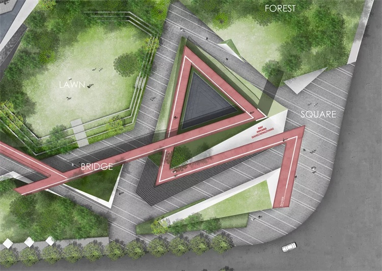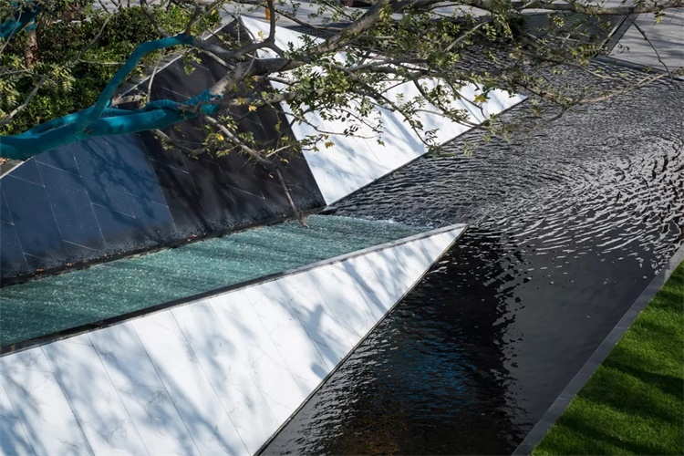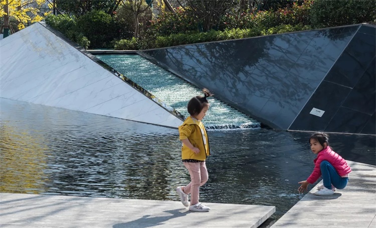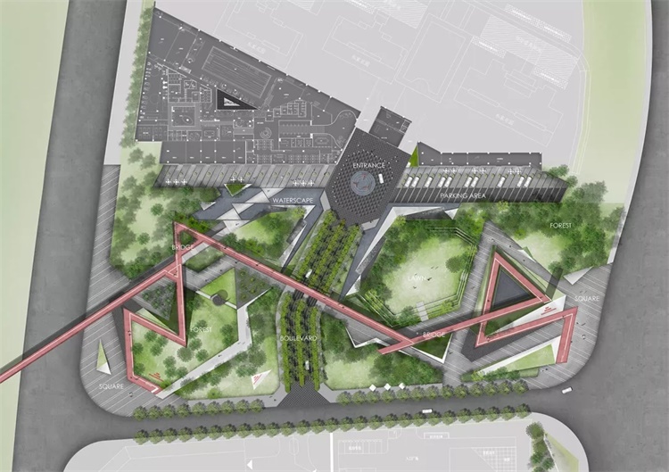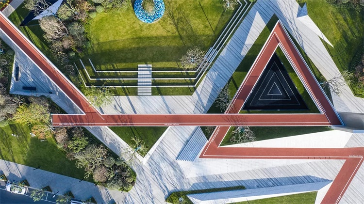 在最初的概念设计中就考虑了对于铺装的特色设计。随着方案一步步的深化,考虑到石材异形的加工的难度与周期,我们将三角形像素化,从整体看来仍然可以呈现出设想的效果。不过在最后和施工单位的交底过程中,他们提出小料石的大面铺贴是很难控制对缝效果的,并且时间周期可能会更长,于是我们便选取了一个折中的方式,将大块的异形板分割成几块小规格的板,能够兼顾时间和效果。最终大家对于落地的效果还是比较满意的。