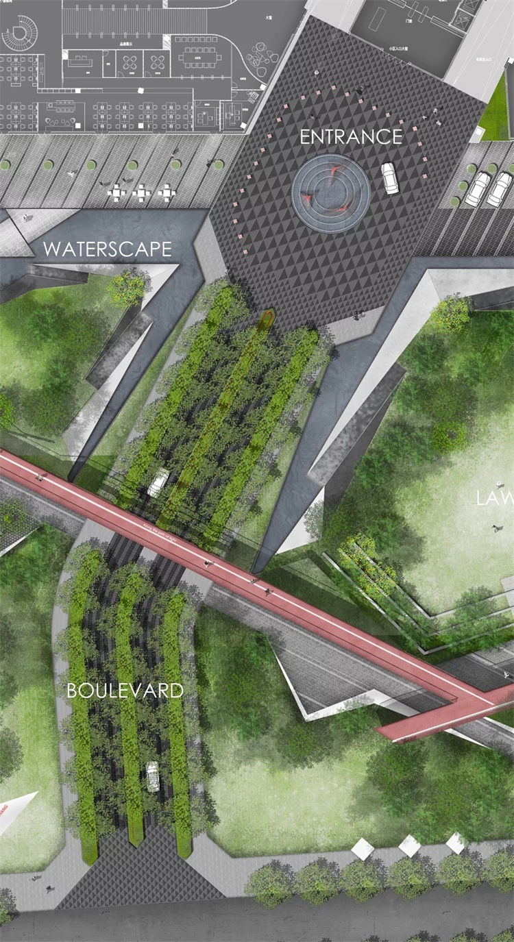 另外一方面,场地还需满足必要的归家功能,从市政道路连接着社区的出入口,我们将车行与人行的动线通过种植划分,保证各自的通行空间,并且在入口处形成落客的环岛空间,另外还需要能够便捷地连接周边的公共空间,使社区与公园交融一体又各互不干扰。