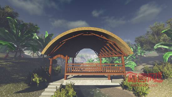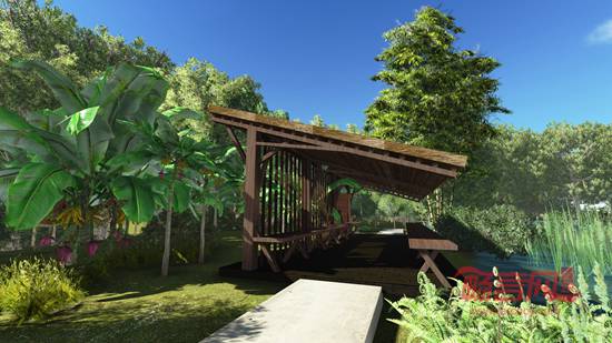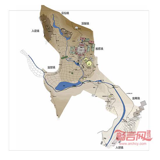 入世境为寺域前区,作停车、暂时休整之用;山门为情境转换媒介,拾阶而上,山林夹道,洗涤心灵,是为出离境;寺院前部为平坦区域,以水田农禅景观为主,视野开阔,设置放生池,种莲养鱼,利用参天古树和竹林营造自然茶室,茶亭茶室与植物互为取景,交相辉映,分布错落有致,形成趣味的园林廊道系统,一派世外桃源景象,是为出世境;寺庙殿宇区域为拜佛仪式及僧人居住生活场所,以唐风建筑及庭院为主,是为般若境;经过禅堂,石阶引向后山的祖师塔区域,在祖师塔上加茅草穹顶,暗示祖师结茅而居,是为涅槃境;寺庙后方沿山而建的禅修中心和善客堂,为禅修者提供的专修场所,用高大乔木和竹林与寺庙区分隔,获得寂静氛围,是为入定境;后山密林深处,罕有人至,闭关独居,悠然逍遥,是为云仙境。