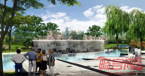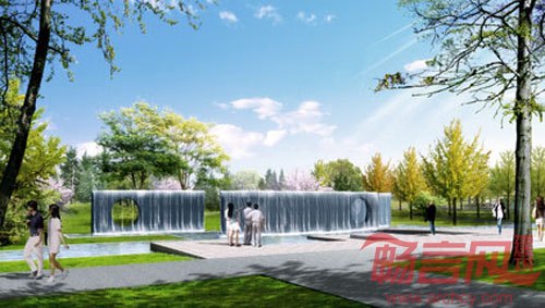 在主入口做跌水景墙,水面稍放大,最宽6米,水岸用几何元素,水系在公园靠近展馆一侧沿原路蜿蜒曲折延伸,构成曲径通幽的意境,水面宽度1.8—3米。