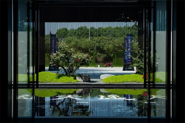 幕帘下月季粉黛静谧、帘上藤本迎上而绽,两旁绿植透过格栅引入厅内,与中间“幕帘”“月季”交相辉映。