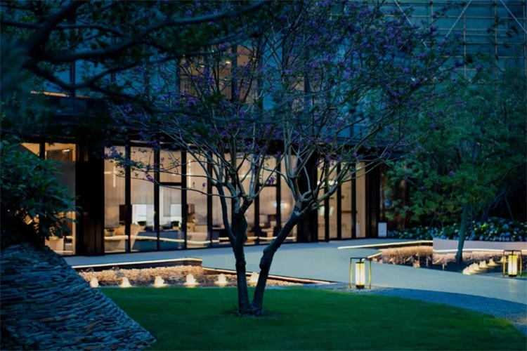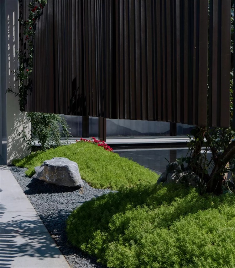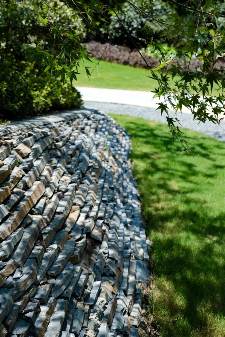 自然味十足的板岩,优美的曲线起伏结合,生机勃勃的绿化,趣味精致的跌水。以及在夜间诗意般的画卷发出了温暖的柔光,诱使人忍不住想要触摸。曲折的洗米石路与板岩堆砌的起伏矮墙映入眼帘,纯净的色调、蜿蜒的道路令人心生期盼。