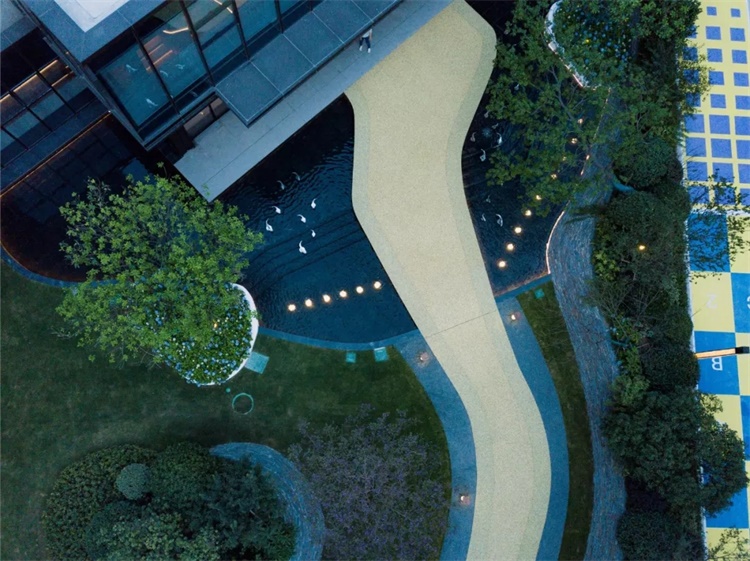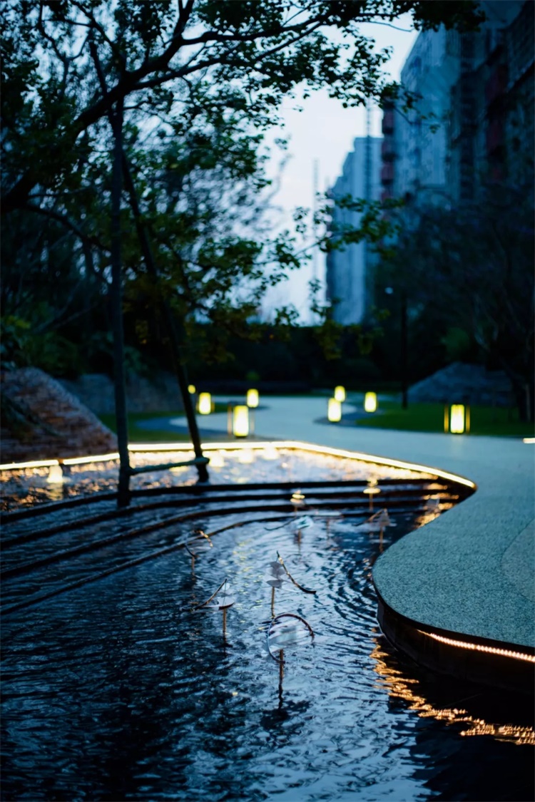 水景中归家的鱼和漂浮花岛与跌水、涌泉巧妙结合,流动的水给鱼儿带来游动的效果,有“归家”的寓意。