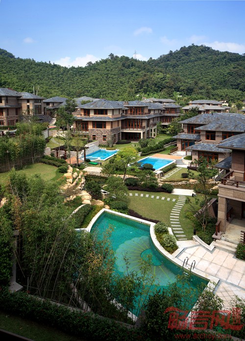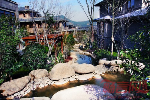 各组团内别墅都配置与该组团主题相应的雕塑、亭台等。为体现坡地、台地园林特色,将山地园林作为背景景观,在各区域设计中点出水景元素,演绎具有不同异域特色的立体景观。每个别墅院落以低矮围墙配合植物群做围合,既保证居家的私密性,又和自然景观融为一体,整个别墅区像坐落于风景如画的生态保护区里。