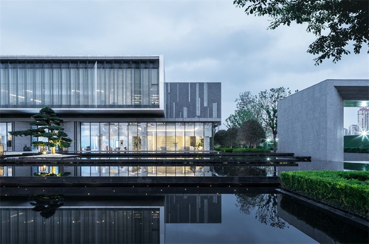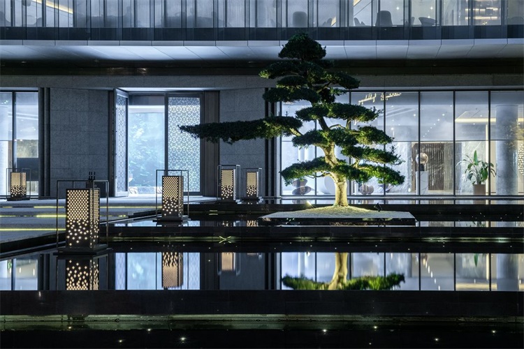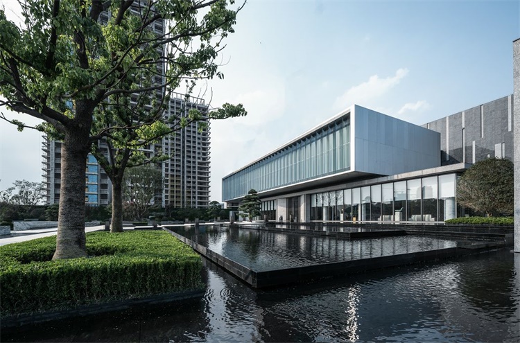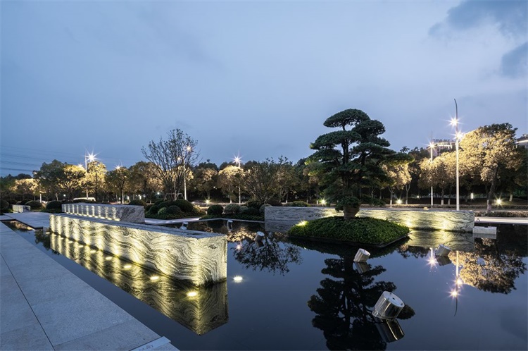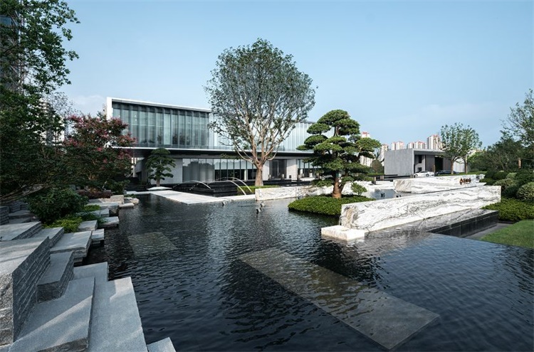 镜面大水景的打造延展了园区的景观空间视觉,造型古松配合白砂石点缀在水面上,将水面的景色烘托出一片古朴,辅以巷道穿梭其中,整个水景不仅充满了江南水乡的风情,还犹有几分神秘气质。