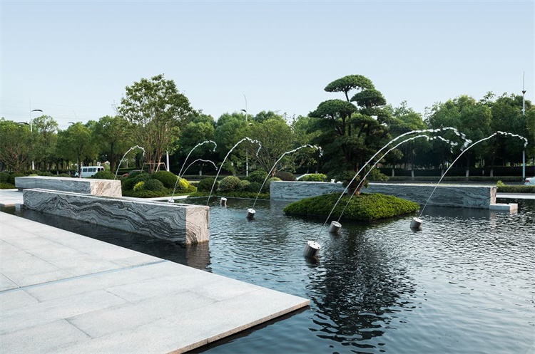 跳泉于水面起舞,如灵动的舞姬,摇摆着柔软的身姿。看似平和的水面景墙其实暗藏玄机,有泉水从景墙上缓流坠下,与大理石拍打出清脆的响声,再徐徐融入大水面中,天地在此一静,日月与其同辉。