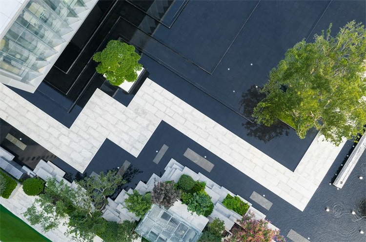 迭石区域软景设计和迭石的几何形态呼应,密而齐整,歪杆朴树飘向水面,于水景互动。采用绿色细叶球类植物点缀于迭石上方,背景使用常绿中小乔来分隔南北侧空间。