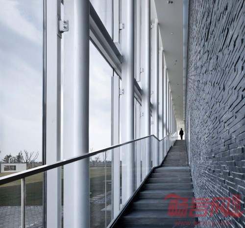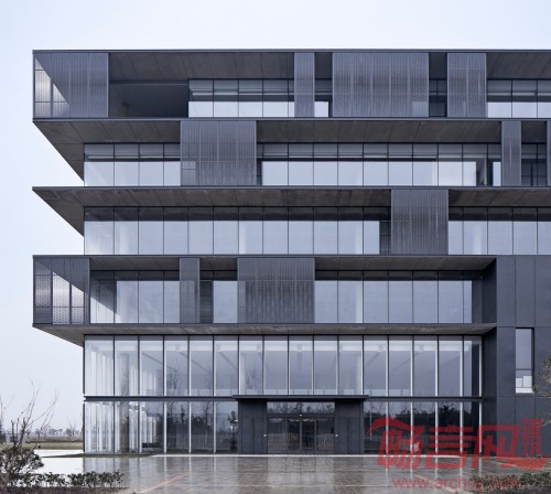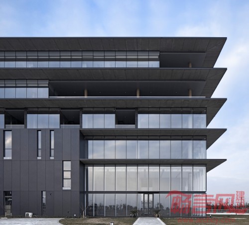 立面强调水平线条,每层环绕建筑的清水混凝土水平出檐出挑2.7m,表达东方传统建筑空间的意象,同时避免阳光直射室内,使办公研发空间有柔和的间接采光。高透玻璃幕墙尽可能模糊建筑的垂直边界,从室内感受出檐的水平延展。