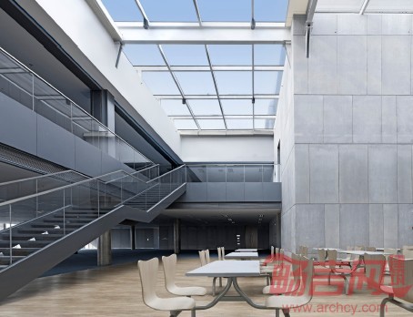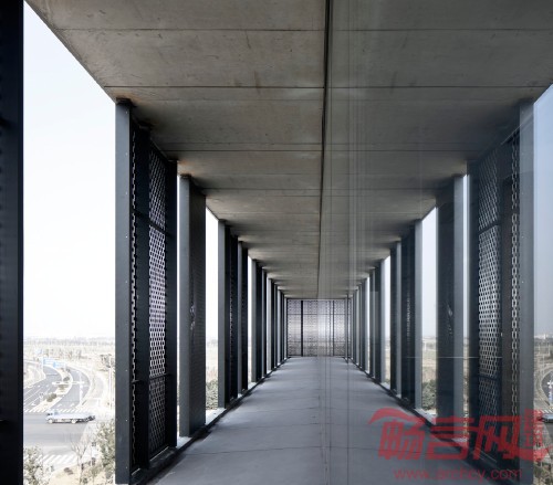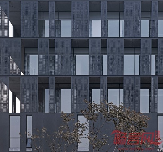 建筑立面的铝板幕墙,采用热转印技术,使深灰色铝板具有肌理和质感,回归建筑的质朴本质。北立面与西立面外挂穿孔铝板,孔洞大小与疏密有序变化,对入射的太阳光进行微妙的调节。