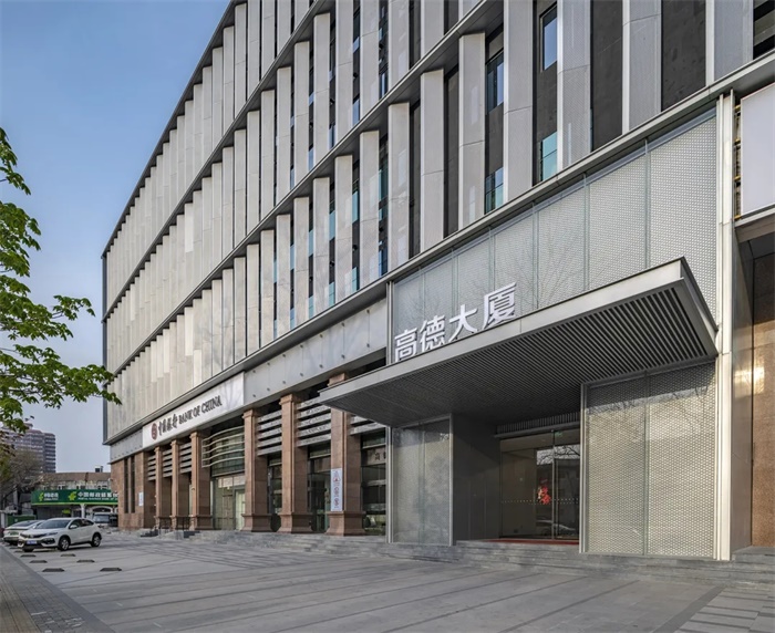 位于北京海淀花园路十字街角的高德大厦建于上世纪90年代,是区域内为数不多的高层标志性建筑,布局呈L形。建筑分为两段式,首二层立面及柱廊为红棕色石材,三层及以上为米白色湿贴小方砖,由于年代久远,砖体已有脱落。