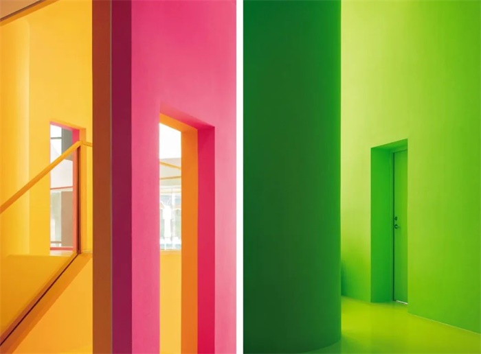 建筑立面系统采用的黄色、橙色、粉色和绿色也反映出建筑不同的功能空间。裙楼的丰富颜色传达出这栋大厦主要为妇女儿童服务的功能目的;塔楼的高层区域设置了酒店配套,采用了更加中性的白色立面。在地面层,建筑的四个主要入口采用了不同的颜色区别,各自发挥了引导作用,同时用欢乐的颜色和亲切的氛围欢迎来到这里的人们。