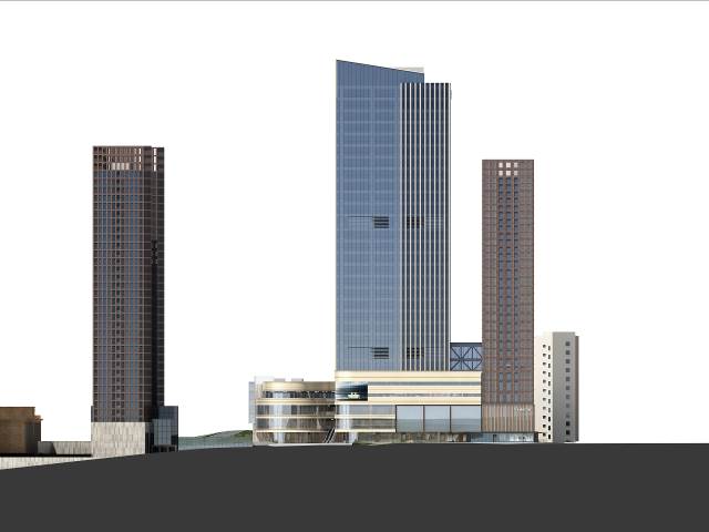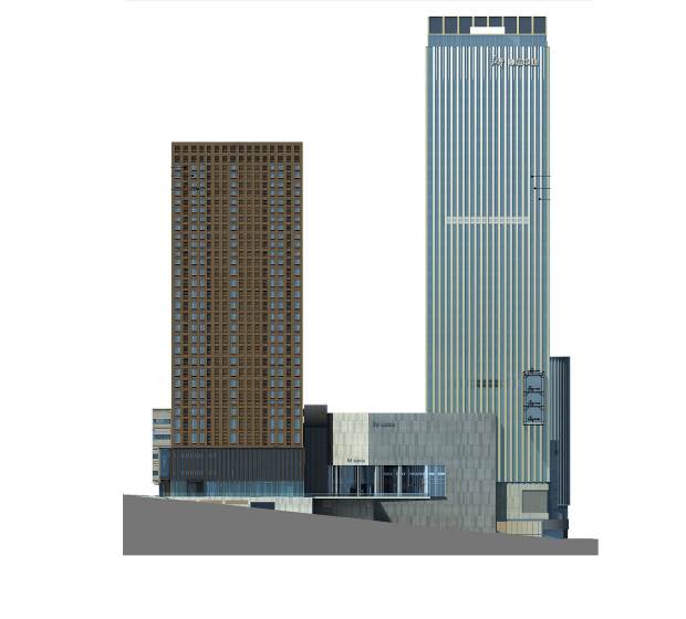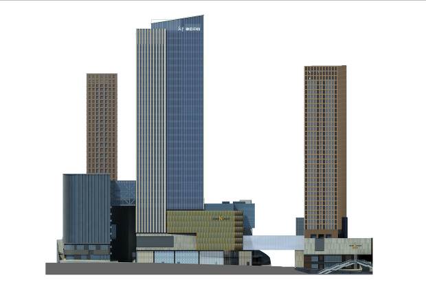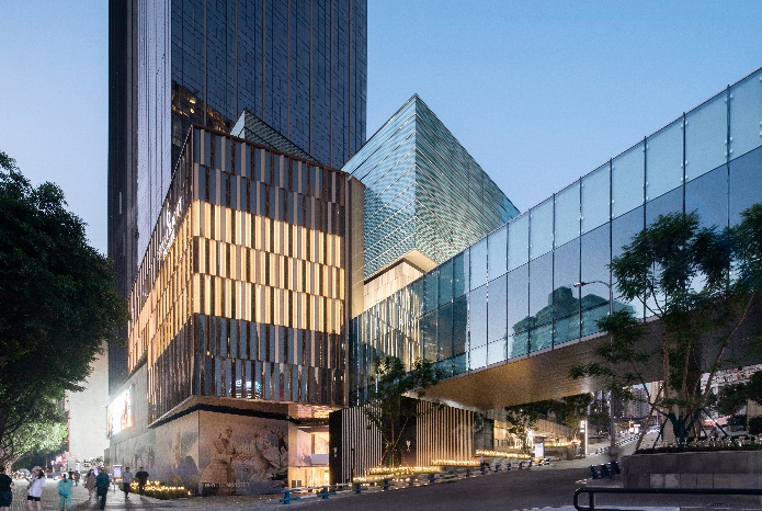 “我们希望充分利用场地极具重庆地形特点的大高差,构建不同的城市界面,以不同的商业场景和多样的氛围体验,将高差劣势转化为项目特色,打造重庆的商业新地标。” Aedas全球设计董事王烨冰如是说。设计将北侧高点作为生活界面,通过公寓塔楼、电影院及商业购物中心主入口的形象打造,营造出充满活力的地标场景;南侧低点以典雅的办公塔楼与周边建筑一同营造出高端商务场景,以两种情绪反差,为市民提供多样的空间体验。
