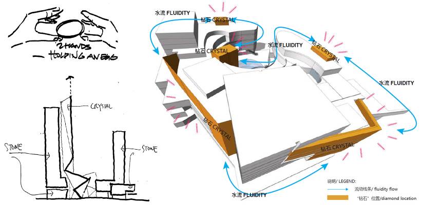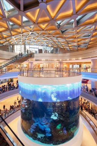 项目力图打造西南高端商业航母,设计创造性提出以海洋作为商业设计主题,水平状流线型立面元素寓意海水的流动,主要入口及临街面通过折叠立面处理方式嵌入玻璃体,呼应水晶概念。当夜幕降临,犹如蔚蓝海洋中嵌入了璀璨夺目的水晶,折射光芒,闪耀全城。并在中庭空间,以无缝的有机玻璃,打造出亚洲第一大室内单体水族馆,整个商业购物中心围绕水族馆以弧形退台的形式构建,360度全景式互动,提供独一无二的购物体验。