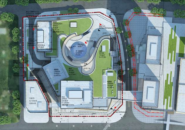 项目紧邻城市主要干道,受重庆山地地形影响,南北两侧道路高差近16米,且地块形状不规则,周边均为已建成建筑,其中东南侧是协信星光68一期。如何在解决高差影响的前提下,让建筑融入周边复杂肌理,串联起各大商业,实现观音桥商圈的升级,是设计首要解决的难点。