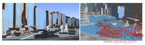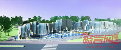 包头气候干旱寒冷,冬季长达近六个月的时间,在这种气候条件下如何营造水景?以及水景的规模是大还是小?这些是关键的问题。若是设计小型的水景,在这样一个开放的环岛中,其水瀑的声音难以掩盖街道的噪音;若是设计大型的水景,噪音掩盖的问题解决了,但在6个月长的冬季中,水景如何呈现和维护?从用地现状和市民使用出发,通过多个方案比选,最终确定以大型的水景墙为市民创造一个闹中取静的休闲广场。受劳伦斯•哈尔普林(L. Halprin, 1916-200?)的波特兰Ira C. Keller喷泉作品中水景舞台的启发,设计小组以“夏天的瀑布•冬天的雕塑•市民的广场”为主题构思,创作了壮观的水之墙方案(图2,5)。