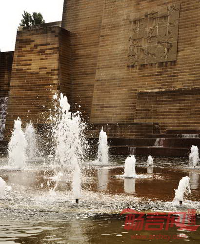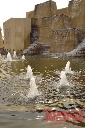 在空间位置上,广场作为交通环岛和儿童公园的边界,是一种嘈杂与静谧的分隔,在空间上需要隔断又不要视线上的绝对隔绝。壮观的水之墙主体长度约88米,总高度达10.8米,其体量对环岛和儿童公园有明确的分隔作用。如此巨大的体量,怎样与环岛的三鹿雕塑和城市环境协调,还能准确和诗意地营造出夏天的瀑布和冬天的雕塑的效果?包头北面的阴山一直是蒙族人引以为豪的护佑,因此设计中水墙以连绵起伏的阴山为原型,抽象成高低起伏的片墙组合,形成壮观的水之墙(图3)。为使水瀑下泻生动和富有变化,水墙上的瀑布模拟了山间瀑流的下泻,间断地、不规则地从片墙面上或顶部流下(图1,4)。水墙对山的抽象和瀑流对山间水的模拟,隐喻和象征了包头南临黄河,北倚阴山的地理位置。广场空间组织和水墙的细节造型经过几次调整和完善后,最终确定由跌水瀑布、儿童戏水池及中央广场三部分组成(图6)。夏季,广场上富有变化的水瀑、喷泉、动感的景墙与穿越喷泉池和水之墙的平台,为市民营造了一个瀑泉水流的水上舞台(图7,8,9),人们在这里拍照、会友,踱步穿过水墙或戏水,甚至是坐在广场上静静地看着水瀑和车来车往。