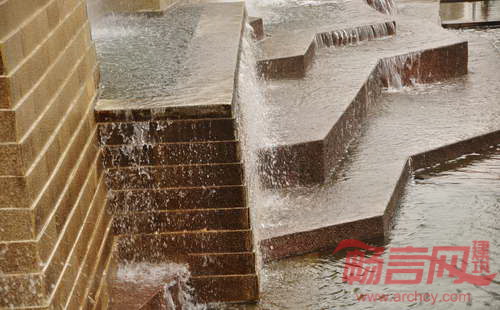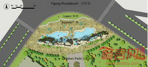 现场调研中我们发现一宫环岛的机动车流量大,噪音也大。在这样一个嘈杂的背景中,怎样创造一个不受噪音干扰而受市民喜爱的休闲广场?美国风景园林师泽恩(Robert Zion,1921-)在帕雷公园(Paley park)中以水墙掩盖街道噪声的手法立即闪现在脑海,由此奠定了广场要营造水景的基调。