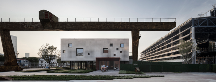 经过评估,红线范围内遗留的两座厂房建筑较为完整并具有保护价值。其中,一号厂房外立面红色的砖墙和局部的镂空拼砖方式很有特色,而三号厂房则具有200多米几乎横跨基地一大半的震撼尺度,在场地内成为主导性的存在。在连续的柱列和屋架形成的强烈秩序之外,横向的清水混凝土的预制遮阳板充满着力度与韵律感,又极具工业美学特质,反映着当年的设计和建造水平。