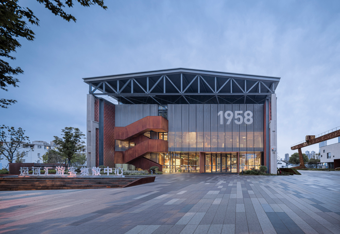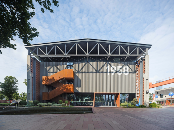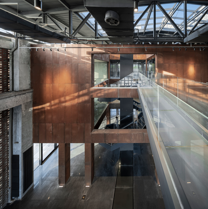 建筑内部嵌入了一个十字轴空间体系,一方面清晰划分了公共空间和功能空间,另一方面则成为了项目整体十字形空间主轴在建筑内部的延续。其中公共部分为3层通高的发布大厅,大厅内部裸露的混凝土排架柱、耐候钢板以及上部的屋顶桁架充分体现了结构和材料美感。
