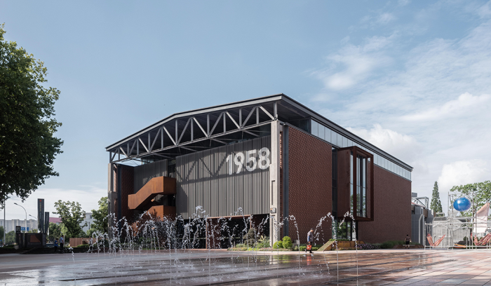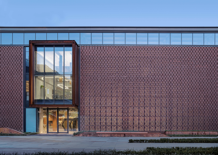 在建筑外表皮部分,采取的策略是延续并强化原厂房的红砖肌理,将老厂房局部的镂空花砖提炼后形成外立面的整体语汇特征,并加入玻璃砖与红砖进行虚实组合,形成一种“新旧互映”,既是溯源,也是再生。