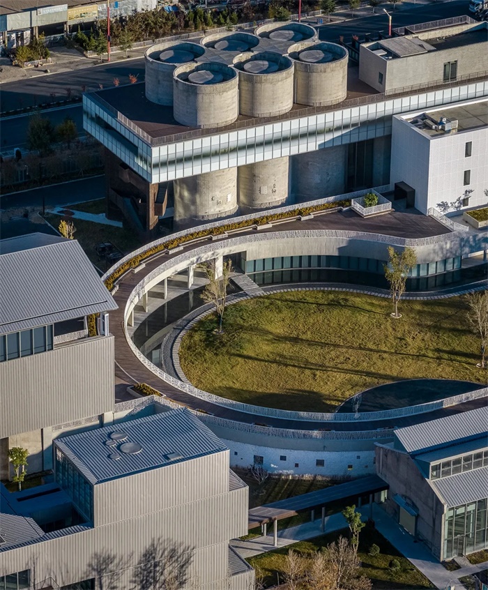 老水泥厂原有的水泥生产线保存较为完整,厂房建筑单体和各种设备散落分布于整个场地内部,我们在详尽地勘察厂区建筑及设备现状后,通过对新老空间的重构,重新编织空间完整和体验共享的新叙事。新的设计融合了工业遗产的分散布局,巧妙地将美术馆的主要功能分解为集中的主展馆与围绕主馆的三个配套附属区域,形成四大分区。