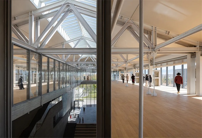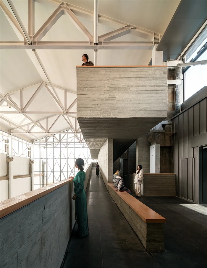 西藏美术馆的总体设计策略,是试图平衡拉萨城市东西两翼日渐失衡的空间与文化发展状态,成为拉萨西部的公共活动中心,其开放式布局整合考量了场地发展的可能性,塑造出充满想象力的城市愿景。在社区贡献方面,美术馆的分散布局使教育和商业等公共设施能够更充分地满足周围社区的需求。这是一个不仅适用于艺术爱好者的空间,也是适合所有人的空间。在工业遗产保护方面,水泥厂的工业记忆没有丢失,而是在新的艺术空间中保存完好。叠加时间线索的空间魅力显而易见,昔日的工业生产线已经转变为激活城市艺术活力的引擎。