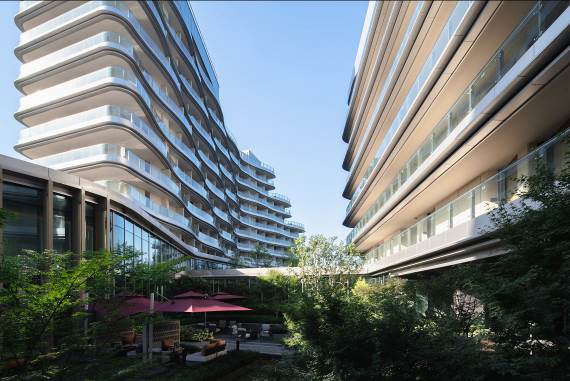 裙楼结合广场、街道、公园、水系、餐饮、运动等空间,构成富有特色的多层次公共空间。1,250平米的宴会厅设置于酒店西侧,与地块南侧的公园无缝连接,可延申作为会议、婚礼、宴席等活动的使用。