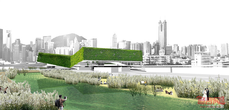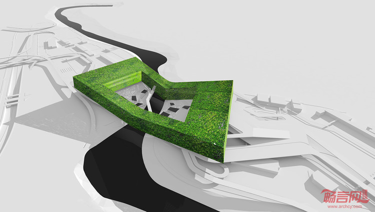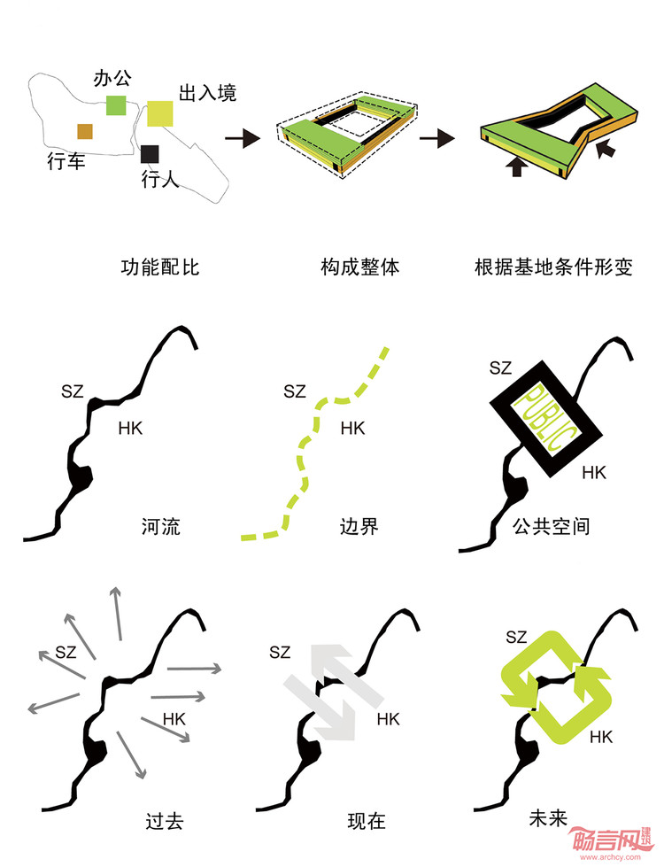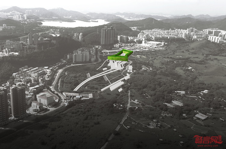 “绿环”:在邓小平的“一国两制”制度的影响下,深圳已经从一个小渔村发展成为一个两千万的大都市。深圳与香港两座城市在经济,政治和文化的交换正在经历“大跃进”式的发展。在这个背景下,新的通关口岸大楼应不只是一个交通转换,而也应该是一个两座城市交流的符号。因此,我们尝试超越其作为交通建筑的功能,创造一个两座城市之间的公共空间。这座建筑模糊了两座城市之间的政治边界,使城市之间的差异逐渐融合。