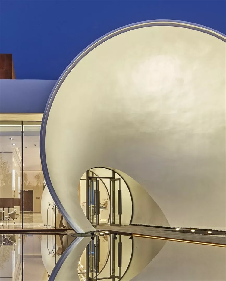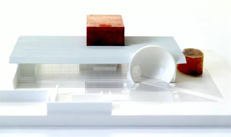 立面上的“正圆母题”,曾经出现在200多年之前法国建筑师布雷(E.L.Boul lee)笔下著名的牛顿纪念堂(1784)。对于东西影工作室来说,现代主义的先驱就是这样的一个关乎形式、关乎结构、关乎空间消解的信念。