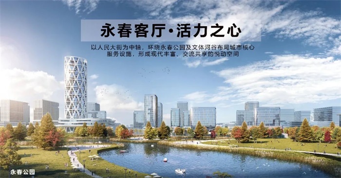 城市设计凸显生态适宜、功能兼容、弹性生长的永春空间秩序。以精细的柔化界面打破城市与自然的界限,以模块化组团布局为城市功能预留弹性空间。重点打造城市客厅、科创中心、智造T台、河谷生态小镇、绿色低碳家园等城市空间。建筑环绕公园错落有致,充满现代感的立体丛林和未来感的光影广场,为世界友人提供交流共享、放飞个性的悦动空间。