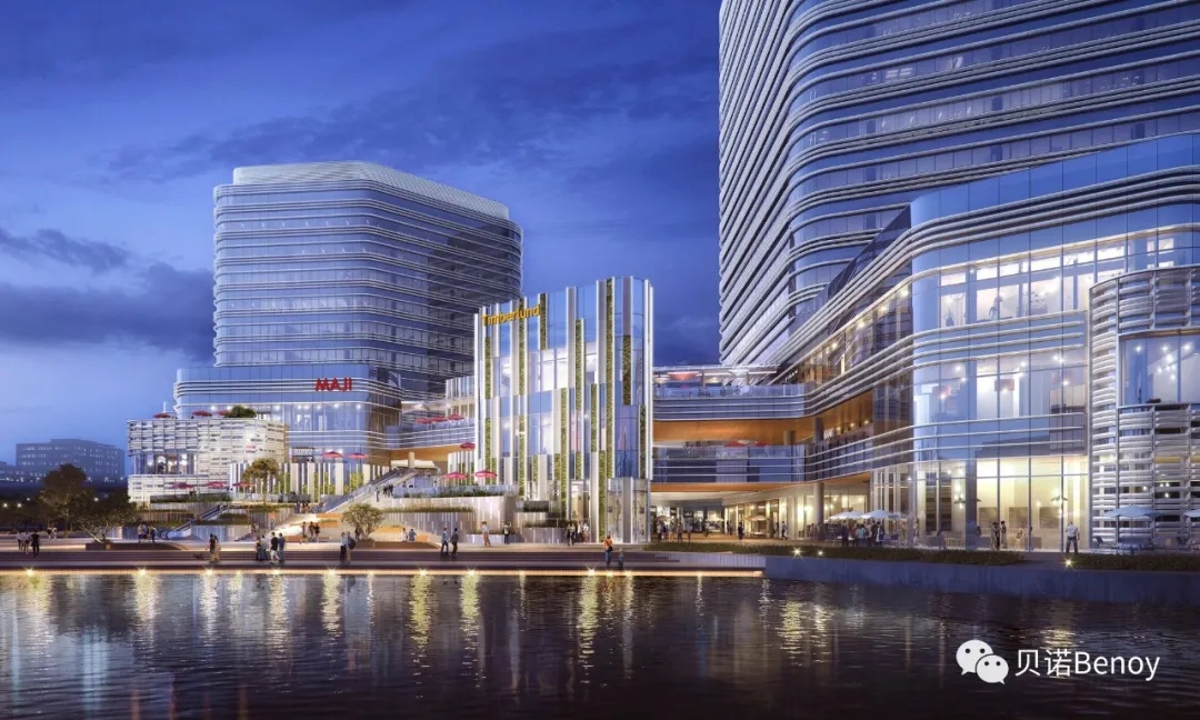 通过设置架空的人行系统强化地块重点区域和可持续高效交通系统之间的相互联系,由此将地块内的机动车交通量降至最低。基地南面临水。通过沿南面水面,商业裙房处理成层层跌落的退台空间,结合滨水大平台和中央庭院。最大化地延长了滨水的景观面以及活动场地。滨水部分处理为小尺度相连的折线,以打造宜人尺度的滨水休闲空间。Benoy同时对街区和建筑单体进行了精心设计,将其打造为多用途混合的综合体以创造不同的特殊体验,并赋予项目个性和提升附加值。